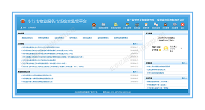 《毕节市物业服务市场综合监管平台》基于物业服务市场政务审批和行业监管业务需求,搭建贯穿市—县—企业—业委会—社会公众的物业监管应用平台,建立起辖区内物业服务市场的企业库、人员库、项目库、信用信息库等多个专项数据库,实现物业管理部门对企业的资质管理、信用评价管理、异地备案、承接查验、维修资金申报审批、物业服务项目合同备案、招投标监管、国家级(省级、市级)示范项目申报、业委会监管等多重政务管理功能。