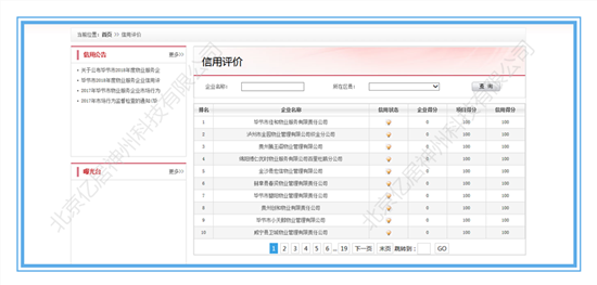 该平台主要用于对物业企业和执(从)业人员的基本情况、管理人员情况、项目情况、良好行为、不良行为等情况进行动态跟踪和管理,建立物业企业和执(从)业人员信用档案数据库,动态发布物业企业信息和信用档案有关信息,接受社会对物业企业行为和执(从)业人员的监督,加强政府对物业企业监管,提高管理工作的透明度和物业企业和执业人员的社会公信力,形成公平竞争的物业服务企业环境。从“企业基本信息管理”、“企业信用评测管理”、“企业诚信档案管理”、“企业信用监督”这四个方面全面构建企业诚信监管体系。