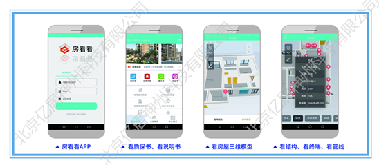 基于“房看看”APP,查看住宅信息、单体建筑信息、参见单体信息、服务单体信息、公共设施设备说明、室内设施设备说明、装修注意事项、房屋使用注意事项;沉浸式实景查看房屋三维模型、看结构、看管线、看图纸、看尺寸、看终端、看说明、看配套、看面积、看全景、报维修、提建议等应用功能。